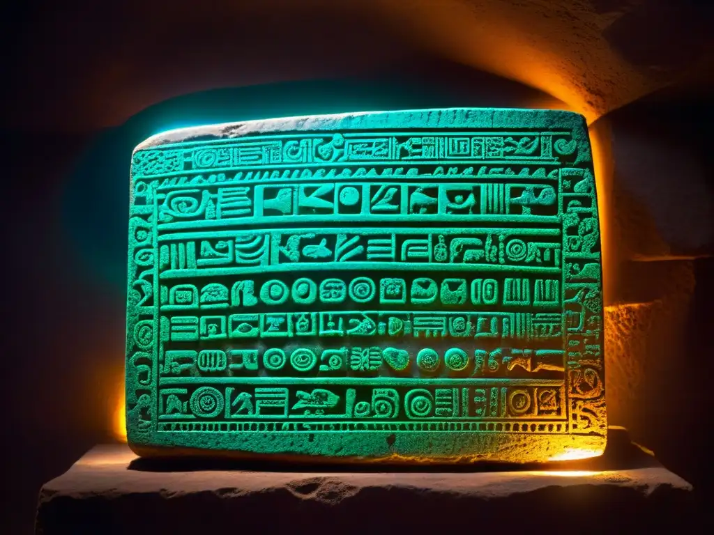Detallada imagen de tableta Rongorongo con intrincadas inscripciones y desgaste visible, sobre fondo oscuro evocando misterio y sabiduría ancestral